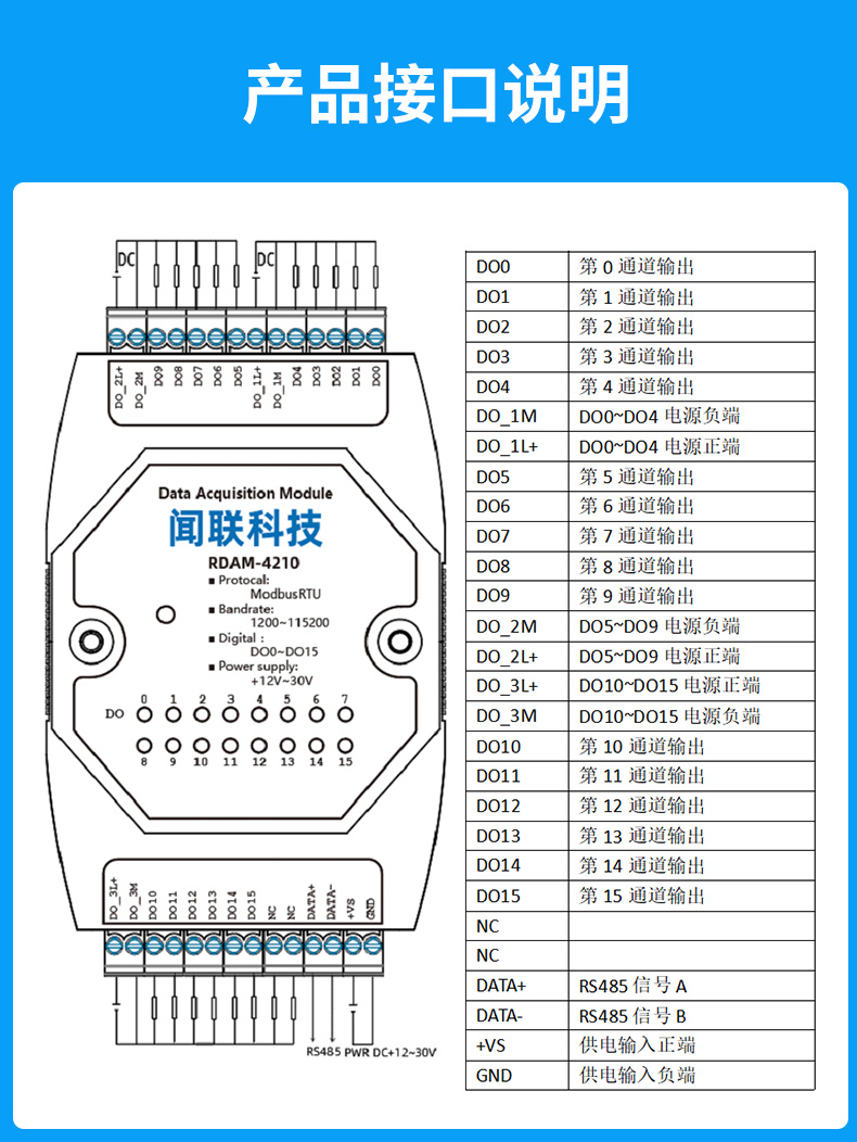 RDAM-4210是一個(gè)基于標(biāo)準(zhǔn)Modbus RTU協(xié)議的遠(yuǎn)程IO模塊,可以與組態(tài)軟件、工控屏、PLC等支持MODBUS主機(jī)的設(shè)備組網(wǎng)。本模塊具有16路光耦隔離輸出,RS485通信全隔離適用于各種復(fù)雜的環(huán)境。